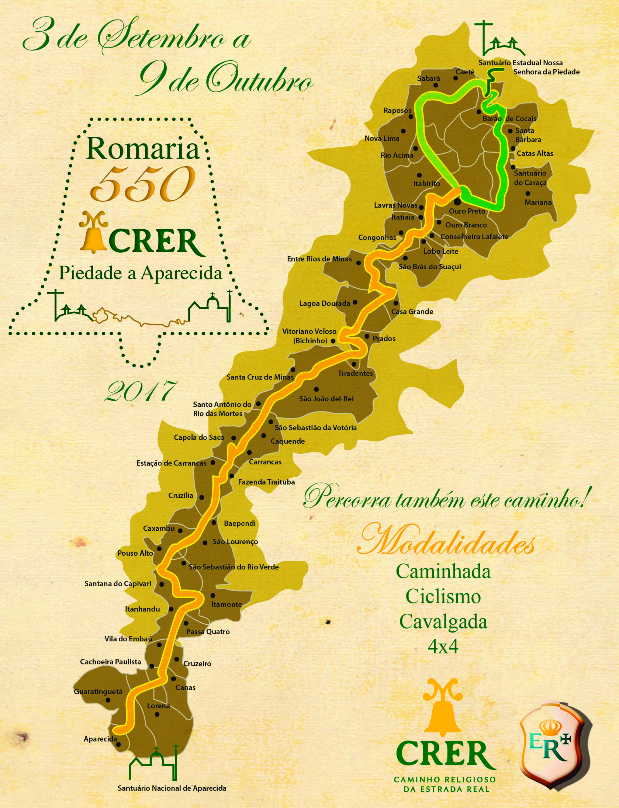 Essa história tricentenária de fé e religiosidade será celebrada entre os dias 1 a 3 de setembro, durante a abertura do 2º Salão Nacional do Turismo Religioso, com o lançamento oficial do Caminho Religioso da Estrada Real (CRER), em Caeté. Aproveitando esse momento único, a maior rota de turismo religioso do Brasil realiza a Romaria 550, que liga o Santuário Estadual Nossa Senhora da Piedade, localizado em Caeté, ao Santuário Nacional de Aparecida, em São Paulo, passando por 32 municípios mineiros e seis paulistas, num percurso de mais de mil quilômetros.