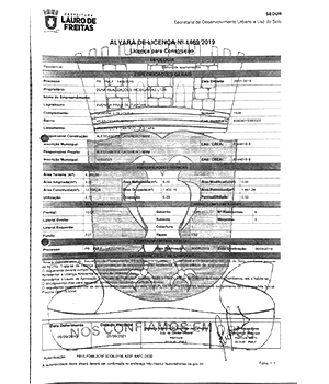 Foto 3 – Cópia do alvará de construção nº 1469/2019, com validade até setembro de 2021, que autoriza a construção do empreendimento residencial de apartamentos na Qd D-26, em Vilas do Atlântico. No site da Sedur (http://sedur.laurodefreitas.ba.gov.br/), informando no campo de busca o número do processo e o ano, é possível acessar todo seu histórico, como análises e documentos solicitados, até a liberação do alvará.